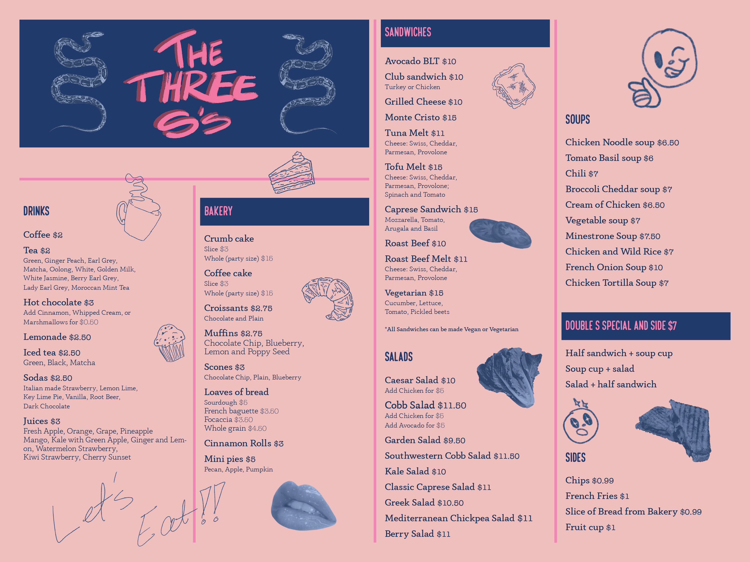 For this project I created a menu design for an imaginary restaurant. I personally like the combo of soups and sandwiches but my mom likes soups and salads together. So, instead I combined them all into a restaurant similar to a Panera. I named the imagined restaurant "The Three S's" standing for sandwiches, salads, and soups. I developed the menu items that were to be offered at my restaurant and the prices as well. I wanted my restaurant to be a fun vibrant place to hang out and maybe do some work while enjoying a good meal and I tried to reflect that in the design as well. I really enjoyed playing with the colors and visual elements in this project, along with creating a collage-like feel with the images and illustrations scattered across the menu.
